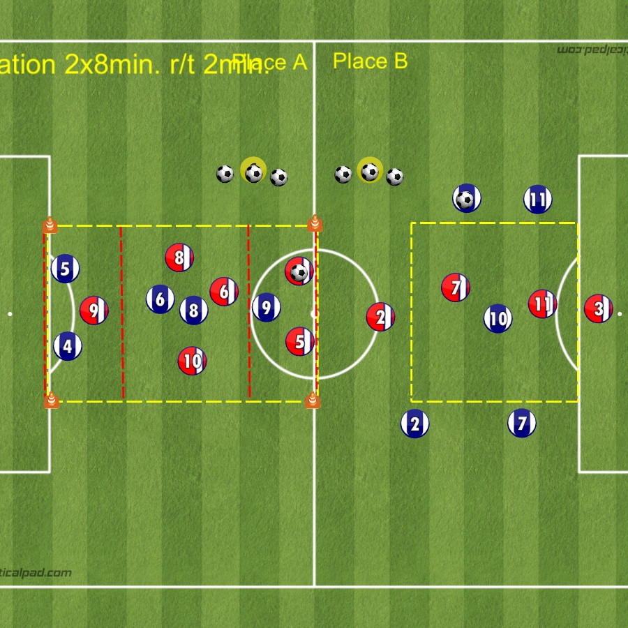 Midfield 4 plus front 2 attack 2 centre backs. The aim is to hit the strikers early and work on midfield support. The 2 centre. backs are live on strikers touch. There is a rotation between two…